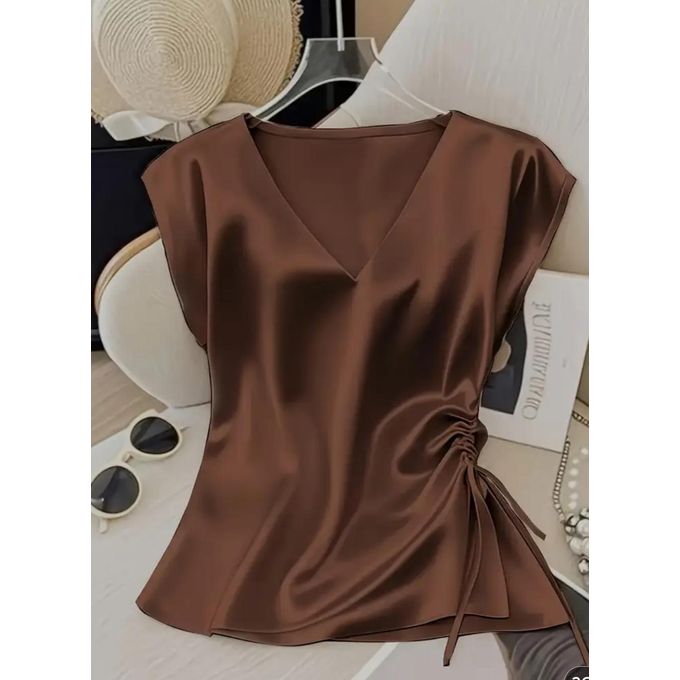 Unique Stylish Silky V Neck- Side Runch Blouse/Top for Ladies - Brown