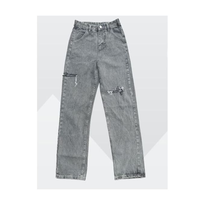 High quality ladies long length baggy cut ripped patterned boyfriend jeans
