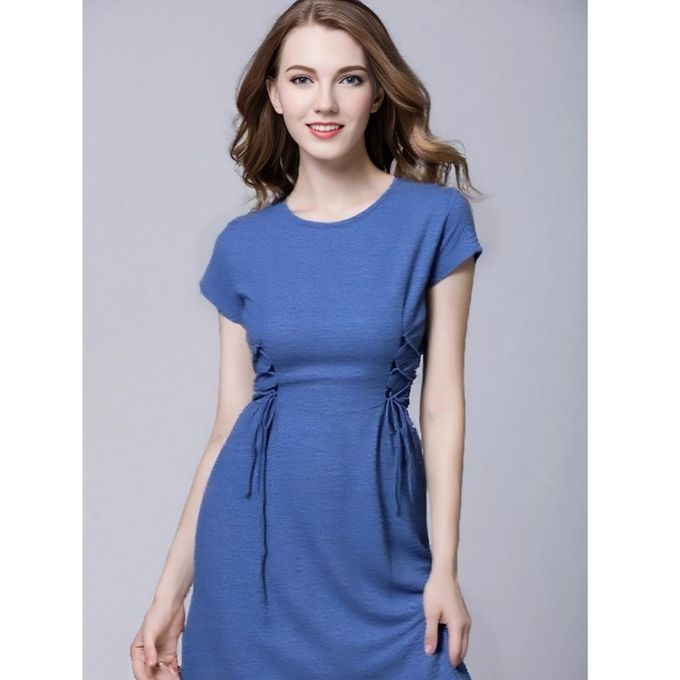 Women's Blue Cotton - Linen Midi Dress with Detachable Waist Ties Short ...