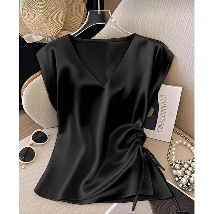 Classy Stylish Silky V Neck- Side Runch Blouse/Top for Ladies - Black
